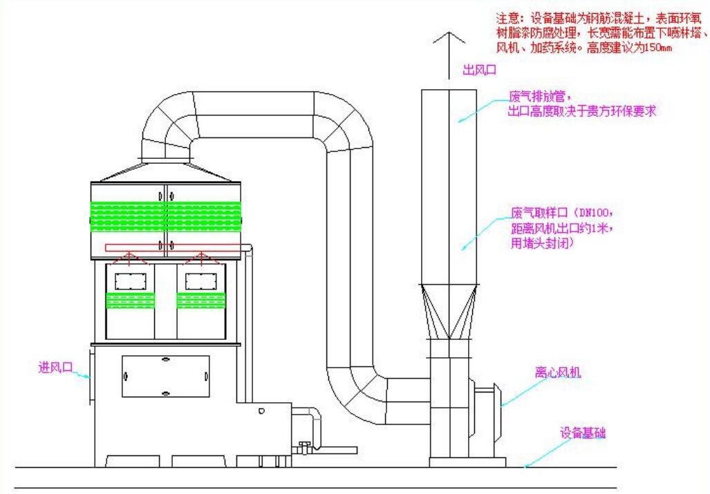 廢氣從方形不銹鋼噴淋塔塔體下方進氣口進入噴淋塔,然后均勻地通過均流段上升到填料吸收段。在 填料的表面上,氣相中物質與液相中物質發生化學反應。塔體的最上部是除霧段,氣體 中所夾帶的吸收液霧滴在這里被清除下來,經過處理后的潔凈空氣從噴淋塔上端排氣管 排放。吸收液在塔底經水泵增壓后在塔頂噴淋而下,最后回流至塔底循環使用。