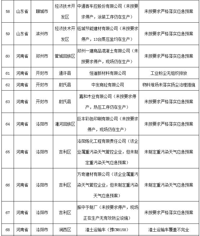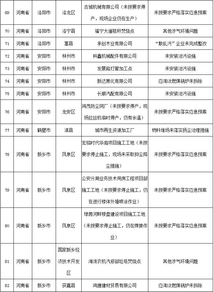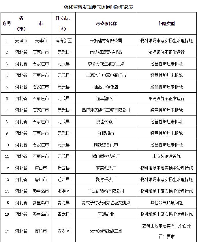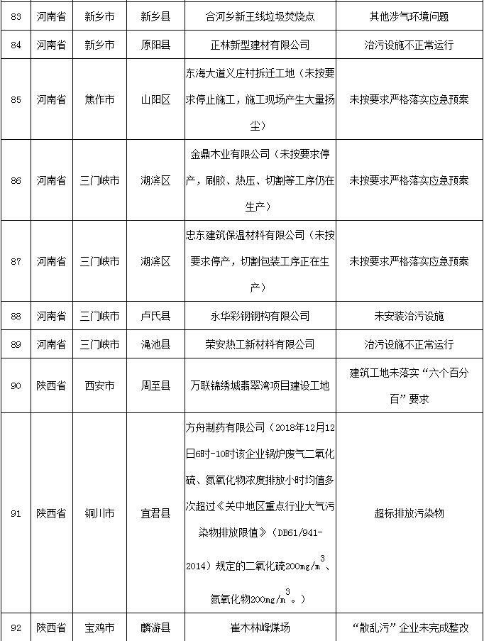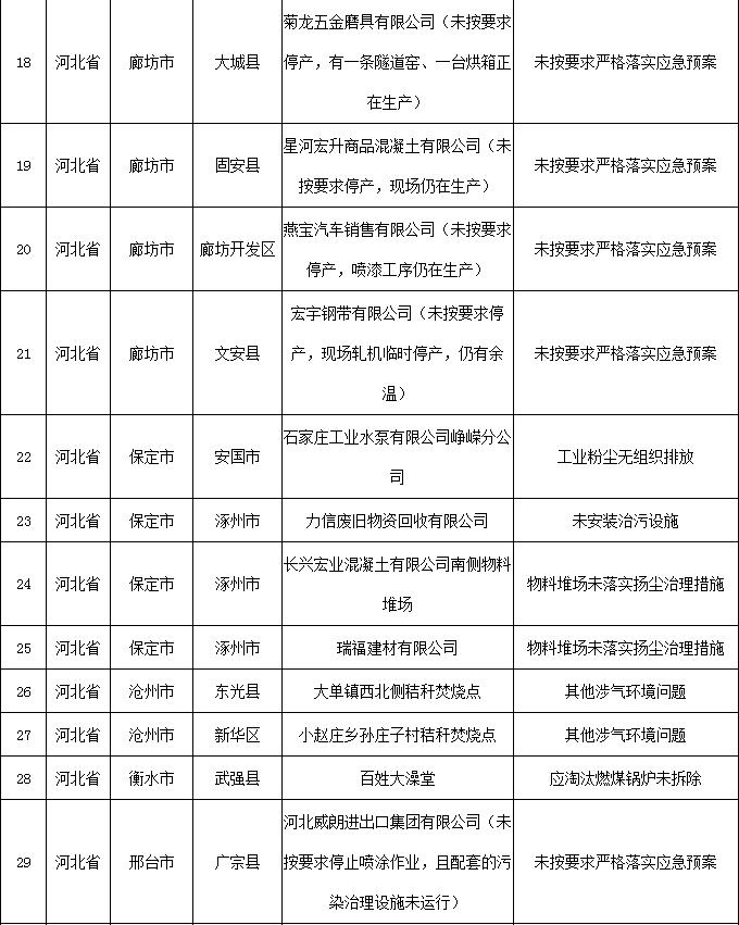 2018-2019年藍天保衛戰重點區域強化監督工作繼續開展,12月13日工作組發現涉氣環境問題80個(其中1家企業有2臺應淘汰燃煤鍋爐,1家企業有2臺經營性爐灶),12月14日工作組發現未嚴格執行重污染天氣應急響應問題23個(見附表)。
